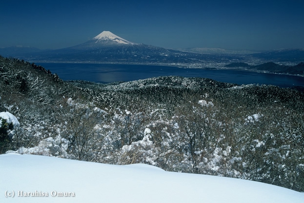 待ちに待った達磨山に春雪が降った! 見渡す限りの雪景に感慨がつのる。 二度と眼にすることはないであろうと諦めていた光景である。 駿河湾には薄っすらと富士の影、この世の全ての塵芥は今影を潜める。 写真をクリックすると 拡大します。 前のページ へ Gallery へ 次のページ へ ▲ページトップへ