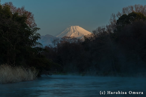柿田川の水温は 四季を問わず摂氏15度 風が穏やかな厳冬の朝 水蒸気は冷え込む大気に急激に冷やされ 気嵐の光景を生む 写真をクリックすると拡大します。 前のページ へ Gallery へ 次のページ へ